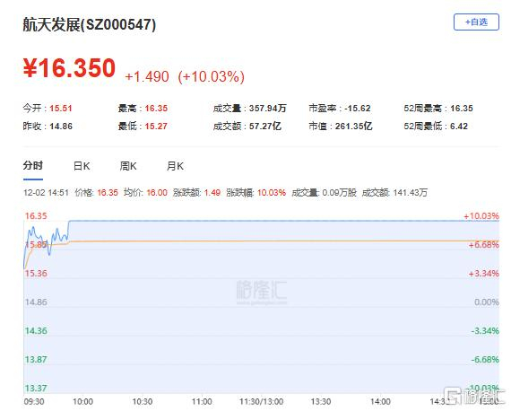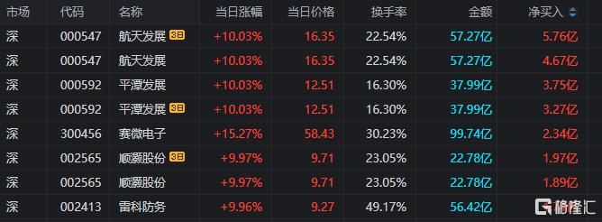 航天发展:今日涨停,全天换手率22.54%,成交额57.27亿元,振幅7.07%。龙虎榜数据显示,机构净买入1.67亿元,深股通净买入1.40亿元,营业部席位合计净买入1.59亿元。