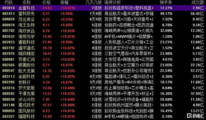 点股方面,福建本地股航天发展13天9板、榕基软件12天7板,并购重组的金富科技7连板,股权转让的梦天家居10天7板,光刻胶概念股国风新材10天6板。