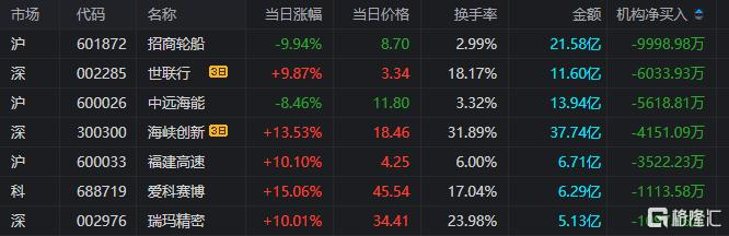 龙虎榜中涉及机构专用席位的个股中,单日净卖出额前三为招商轮船、中远海能、福建高速,分别为9998.98万元、5618.81万元、3522.23万元。