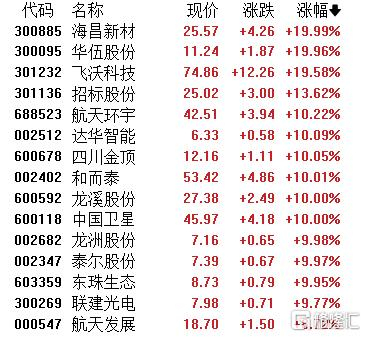 商业航天概念再度走强,海昌新材、华伍股份20CM涨停,达华智能、四川金顶、和而泰、龙溪股份等多股涨停。