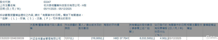 格隆汇12月5日丨根据联交所最新权益披露资料显示,2025年12月3日,泰格医药(03347.HK)遭兴证全球基金管理有限公司在场内以每股均价37.7041港元减持21.68万股,涉资约817.42万港元。