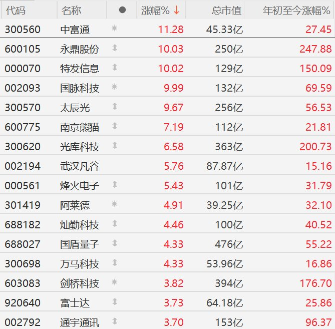格隆汇12月5日|A股市场通信设备股走强,其中,中富通涨超11%,永鼎股份、特发信息、国脉科技10CM涨停,太辰光涨超9%,南京熊猫涨超7%,光库科技涨超6%,武汉凡谷、烽火电子涨超5%,阿莱德、灿勤科技、国盾量子、万马科技涨超4%。