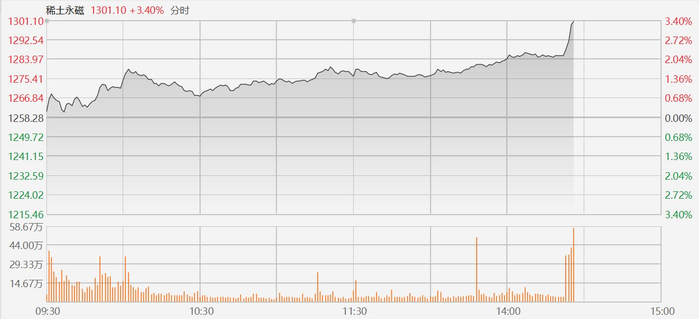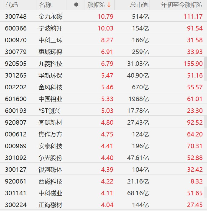 A股市场稀土股拉升,其中,金力永磁涨超14%,宁波韵升拉升封板,中科三环一度触及涨停,惠城环保、九菱科技、银河磁体、西磁科技、中科磁业等跟涨。