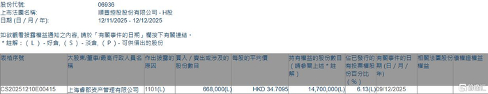 格隆汇12月12日丨根据联交所最新权益披露资料显示,2025年12月9日,顺丰控股(06936.HK)获上海睿郡资产管理有限公司在场内以每股均价34.7095港元增持66.8万股,涉资约2318.6万港元。