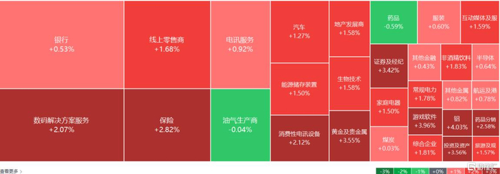权重科技股集体上涨,网易涨超4%,腾讯控股、阿里巴巴涨超2%,小米集团、百度集团、京东集团、快手涨超1%,美团微涨。