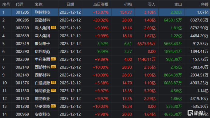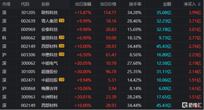 龙虎榜单日净买入额前三为联特科技、安泰科技、中能电气,分别为3.99亿元、3.01亿元、2.19亿元。