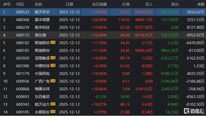 龙虎榜中涉及机构专用席位的个股中,当日净卖出额前三为航宇科技、西部材料、顺灏股份,分别为2.15亿元、1.08亿元、8017.03万元。