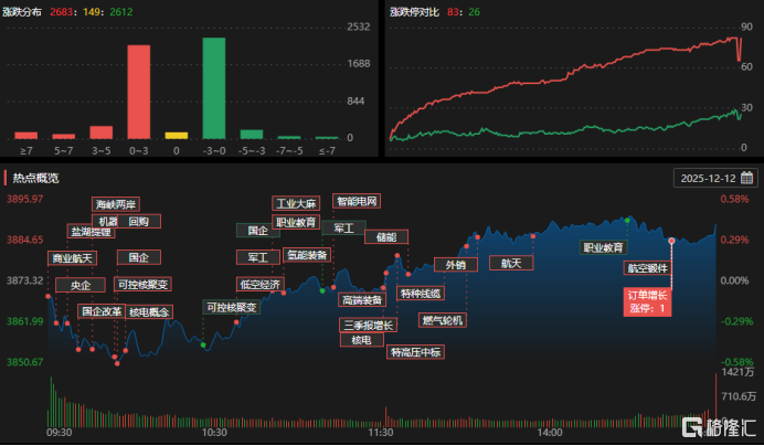 12月12日,沪深两市成交额2.09万亿,较上一个交易日放量2351亿。板块方面,商业航天、可控核聚变、电网设备等板块涨幅居前,而商业百货、免税概念、房地产服务等板块下挫。
