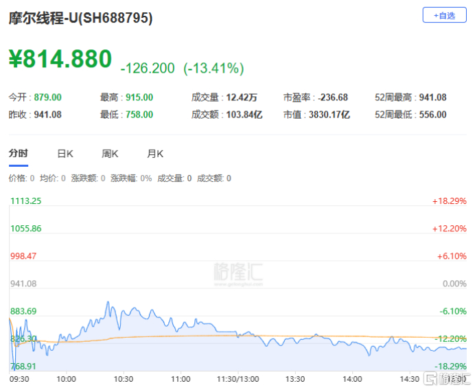 摩尔线程:今日下跌13.41%,全天换手率42.26%,成交额103.84亿元。