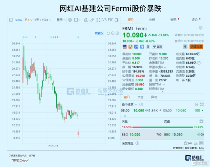 还有一家网红AI基建公司Fermi被爆重要客户取消租约导致股价盘中崩盘暴跌46%,引发更大恐慌。