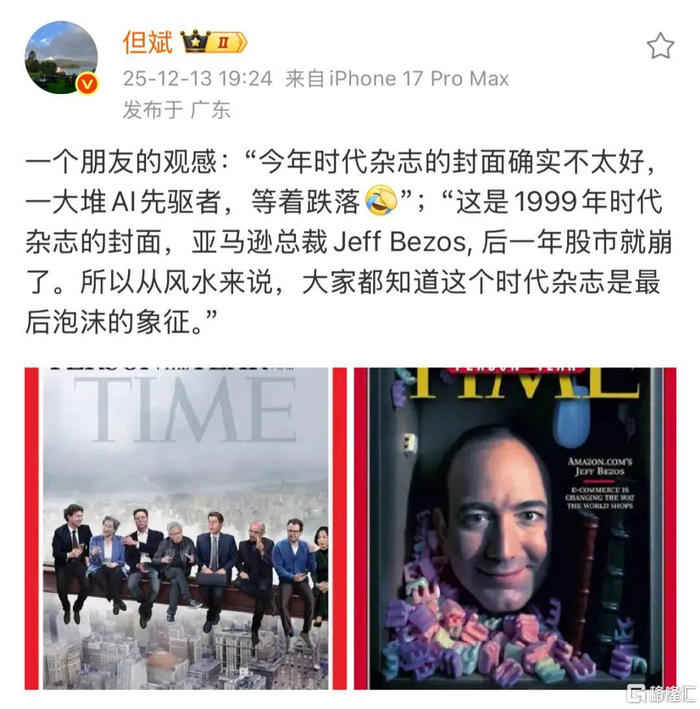 但斌引用一个朋友的观感:1999年时代杂志的封面——亚马逊总裁贝索斯,之后一年美股就崩了。