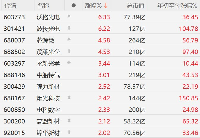 格隆汇12月16日|A股市场光刻胶板块拉升,其中,沃格光电、波长光电涨超6%,芯源微、茂莱光学涨超4%,永新光学、中船特气涨超3%。