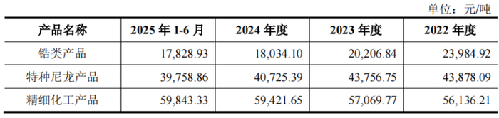2022年至2025年上半年,公司特种尼龙产品的销售单价由4.39万元/吨下降至3.98万元/吨,也是因为原材料二元胺和二元酸的采购均价下降所致。