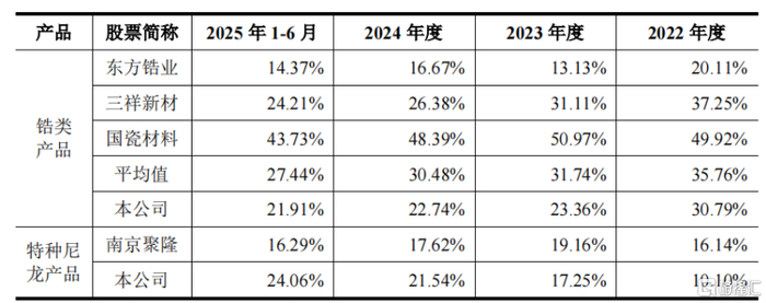 其中,锆类产品毛利率由2022年的30.79%下降至2025年上半年的21.91%,主要是因为锆类产品销售价格下降幅度大于成本下降幅度。