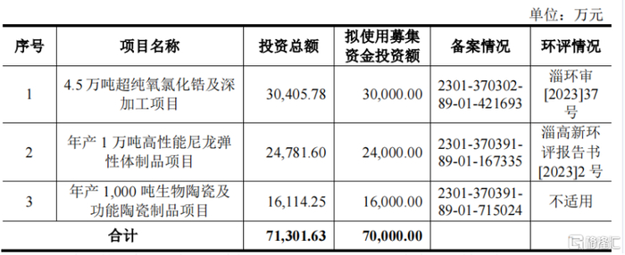 公司本次计划募集资金7亿元,主要用于4.5万吨超纯氧氯化锆及深加工项目、年产1万吨高性能尼龙弹性体制品项目、年产1000吨生物陶瓷及功能陶瓷制品项目。