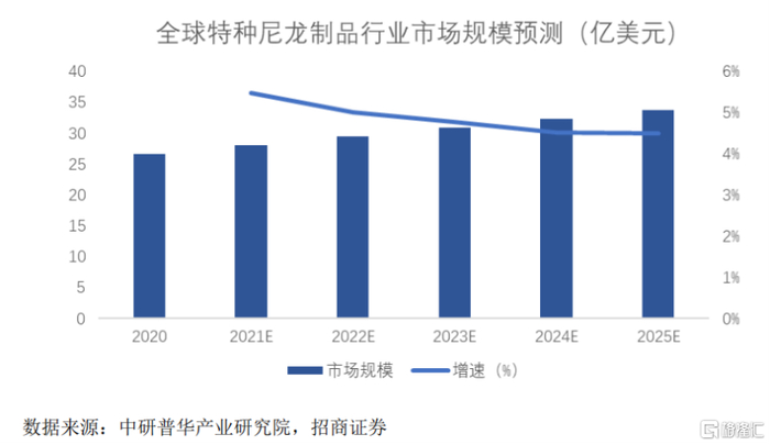 其中,特种尼龙方面,招商证券数据显示,2020年全球特种尼龙市场规模已达26.64亿美元。据中研普华产业研究院预测,2025年全球特种尼龙市场规模将达到33.37亿美元,2020年至2025年的复合年均增长率为4.03%。