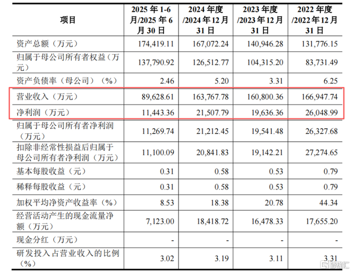 2022年、2023年、2024年、2025年1-6月(报告期),公司营业收入分别为16.69亿元、16.08亿元、16.38亿元、8.96亿元,净利润分别为2.6亿元、1.96亿元、2.15亿元、1.14亿元,经营活动产生的现金流量净额分别为1.77亿元、1.65亿元、1.84亿元、7123万元。