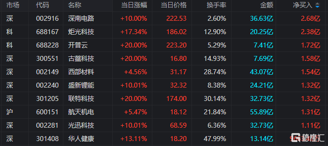 龙虎榜单日净买入额前三为深南电路、炬光科技、开普云,分别为2.68亿元、2.38亿元、1.72亿元。
