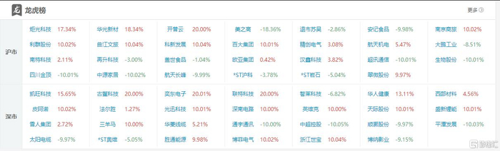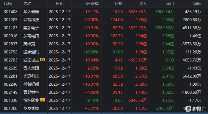 龙虎榜中涉及机构专用席位的个股中,单日净买入额前三为炬光科技、深南电路、华菱线缆,分别为2.91亿元、1.73亿元、1.25亿元。