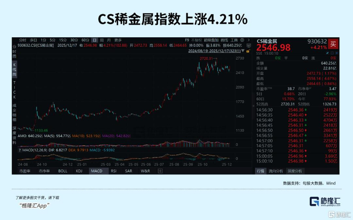 稀有金属ETF(562800)跟踪的,全市场锂矿概念含量最高(占比达到41.59%)的指数--CS稀金属指数,今天强势领涨,上涨幅度达到4.21%。