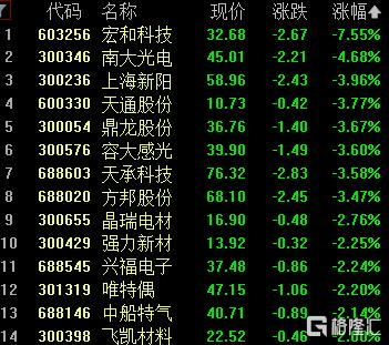电子化学品板块下跌,宏和科技跌超7%,南大光电跌超4%,上海新阳、天通股份跌超3%。