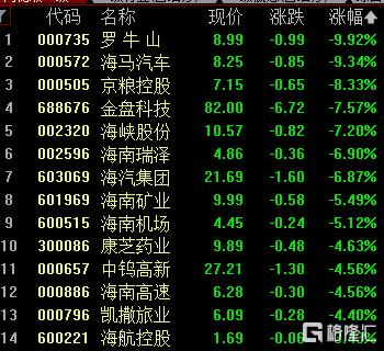 海南板块继续下行,罗牛山将近跌停,海马汽车跌超9%,京粮控股跌超8%,金盘科技、海峡股份跌超7%。