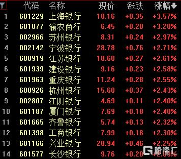银行板块上涨,上海银行、渝农银行涨超3%,苏州银行、宁波银行、江苏银行涨超2%。