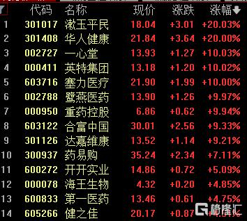 医药商业板块暴涨,华人健康、漱玉平民20cm涨停,一心堂、英特集团、塞力医疗涨停。
