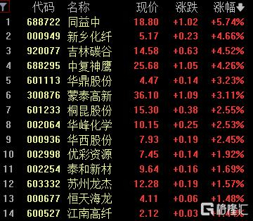 化学纤维板块走高,同益中涨超5%,新乡化纤、吉林碳谷、中复神鹰涨超4%。