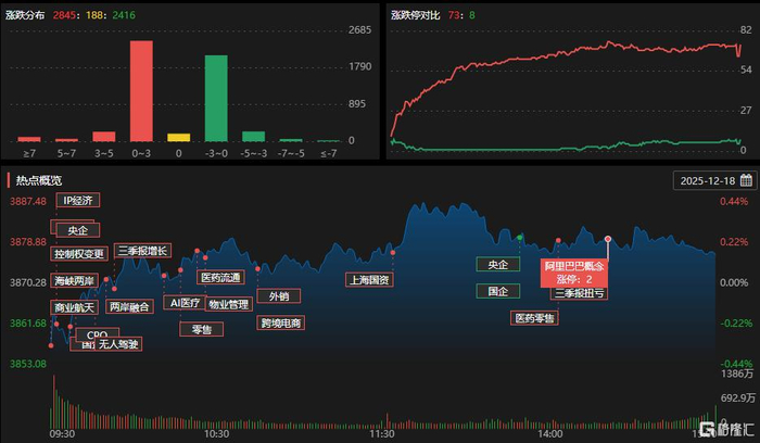 12月18日,A股三大指数涨跌不一,截至收盘,沪指涨0.16%报3876.37点,深证成指跌1.29%,创业板指跌2.17%,北证50跌0.51%。全市场成交额16722亿元,较上日成交额缩量1621亿元,超2800股上涨。