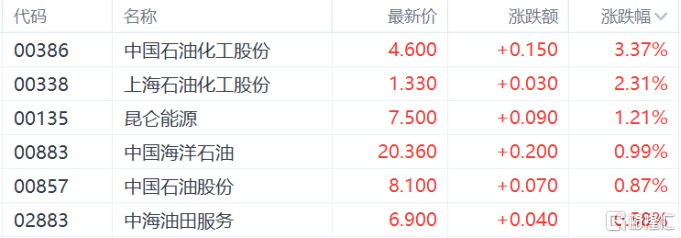 石油股表现活跃,中国石油化工股份涨3.37%,上海石油化工股份涨2.31%,昆仑能源涨1.21%,中国海洋石油、中海油田服务、中国石油股份跟涨。