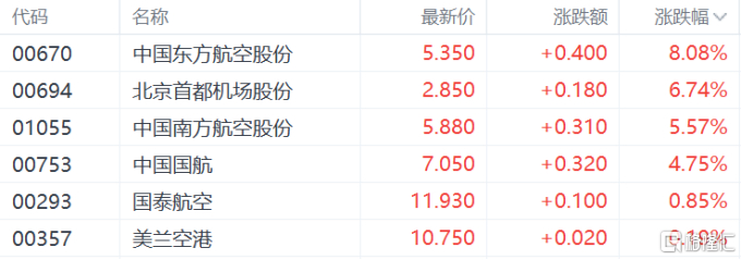 受惠人民币走强、营运数据向好、元旦假期机票预订量急增等,航空股延续增长趋势,中国东方航空涨超8%,北京首都机场涨超6%,中国南方航空涨超5%,中国国航涨超4%。