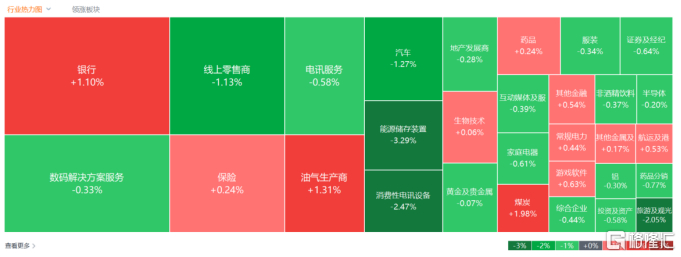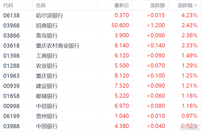 中金料明年内银股营业收入及纯利按年上升,净息差压力进一步收窄,内银股普遍上涨,招商银行涨超2%,工商银行、农业银行、建设银行涨超1%。