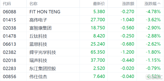 苹果概念股走弱,FIT HON TENG跌4.78%,高伟电子跌3.62%,丘钛科技、蓝思科技、舜宇光学科技、瑞声科技纷纷下跌。