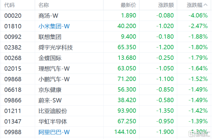 内房股飘绿,世茂集团跌4.48%,建发国际集团、富力地产跌超3%,新城发展、碧桂园跌超2%,龙湖集团、中国海外发展、旭辉控股集团跌超1%。
