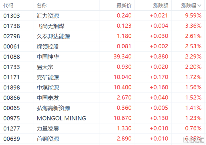 煤炭股普涨,中国神华、易大宗涨超2%,兖矿能源、中煤能源、首钢资源跟涨。