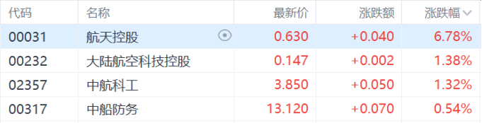 军工股全线飘红,航天控股涨6.78%,大陆航空科技控股、中航科工涨超1%。