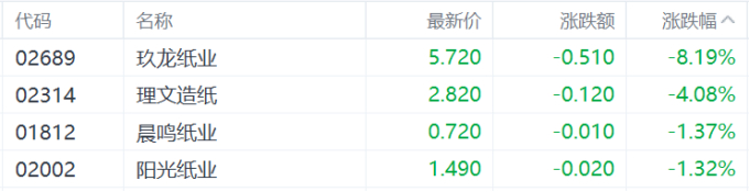 纸业股跌幅靠前,玖龙纸业跌8.19%,理文造纸跌4.08%,晨鸣纸业、阳光纸业跌超1%。