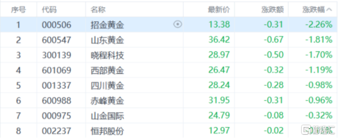 贵金属板块下跌,招金黄金跌超2%,山东黄金、晓程科技、西部黄金、四川黄金、赤峰黄金等多股跟涨。