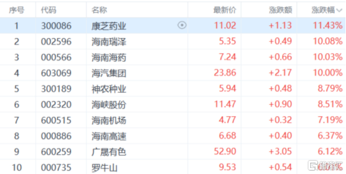 海南板块走高,海南瑞泽、海南海药、海汽集团涨停,神农种业、海峡股份涨超8%,海南机场、海南高速、广晟有色等多股跟涨。