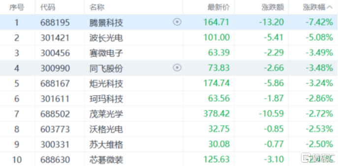 光刻机板块走弱,腾景科技跌超7%,波长光电跌超5%,赛微电子、同飞股份、炬光科技等多股跟涨。