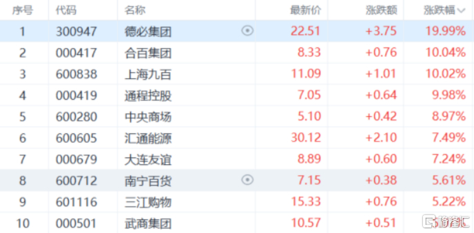 零售板块上涨,德必集团、合百集团、上海九百等多股涨停,中央商场涨近9%,汇通能源、大连友谊、南宁百货等多股跟涨。