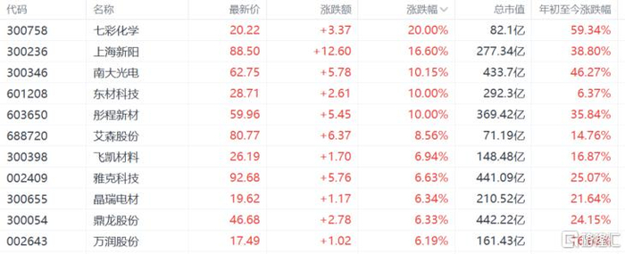 光刻胶概念股活跃,七彩化学20CM涨停,上海新阳涨超16%,彤程新材、东材科技涨停,南大光电涨超10%。