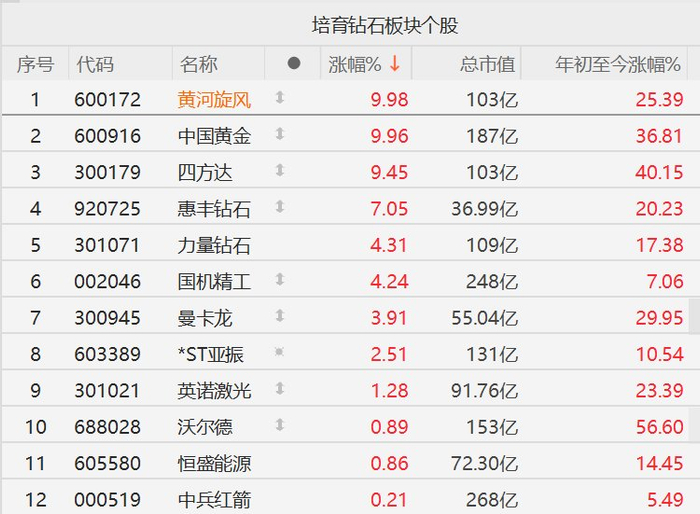 格隆汇1月27日|A股市场培育钻石概念股集体走强,其中,黄河旋风、中国黄金涨停,四方达涨超9%,惠丰钻石涨7%,力量钻石、国机精工涨超4%,曼卡龙涨近4%。