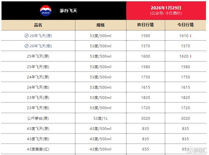 据今日酒价数据,1月29日,2026年原箱飞天茅台价格单瓶价格上涨20元为1610元/瓶,散瓶的价格保持在1570元/瓶,而前几日茅台的批价约为1550元/瓶。