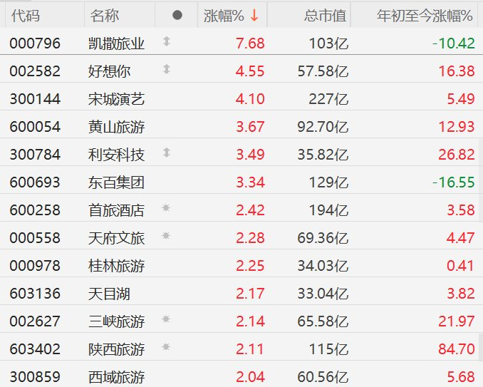 格隆汇1月30日|A股市场部分旅游股表现活跃,其中,凯撒旅业涨超7%,好想你、宋城演艺涨超4%,黄山旅游、利安科技、东百集团涨超3%,首旅酒店、天府文旅、桂林旅游、天目湖、三峡旅游、陕西旅游、西域旅游涨超2%。消息面上,国务院办公厅日前印发的《加快培育服务消费新增长点工作方案》提出,聚焦演出服务、体育赛事服务、情绪式体验式服务等潜力领域。完善旅居目的地基础设施,推动存量设施提升改造。