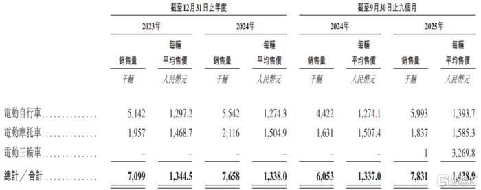 其中,2023年至2025年前三季度,公司的每辆电动自行车平均售价从1297.2元增加至1393.7元,每辆电动摩托车平均售价由1468.7元增加至1585.3元。