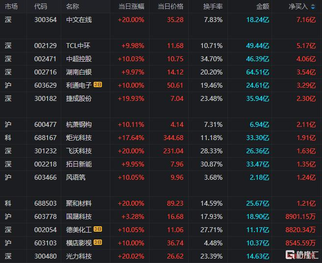 龙虎榜单日净买入额前三为中文在线、TCL中环、中超控股,分别为7.16亿元、5.17亿元、4.06亿元。