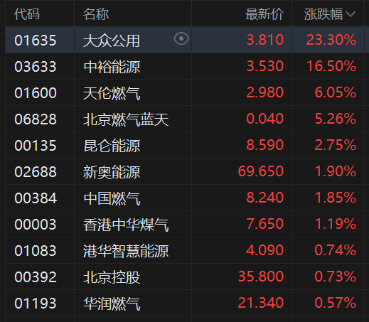 格隆汇3月3日|港股燃气股大幅拉升上涨,其中,大众公用飙涨超23%领衔,中裕能源大涨16.5%,天伦燃气涨6%,北京燃气蓝天涨超5%,昆仑能源、新奥能源、中国燃气、华润燃气等跟涨。
