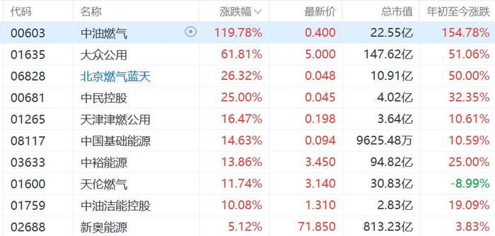 液化天然气价格飙升,港股市场燃气股集体飙升。截至收盘,中油燃气飙升120%,大众公用暴涨超61%,北京燃气蓝天涨超26%,中民控股涨25%,天津津燃公用涨超16%,中国基础能源涨超14%,中裕能源涨近14%,天伦燃气涨超11%,中油洁能控股涨10%,新奥能源涨超5%。